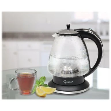 Use this Capresso H2O Glass water kettle to heat water quickly and safely. The measurement markings in ounces and cups facilitate easy filling, and the concealed heating element boils water efficiently and shuts off automatically when done. This Capresso H2O Glass water kettle has a heat-resistant base that is safe to use on most surfaces.